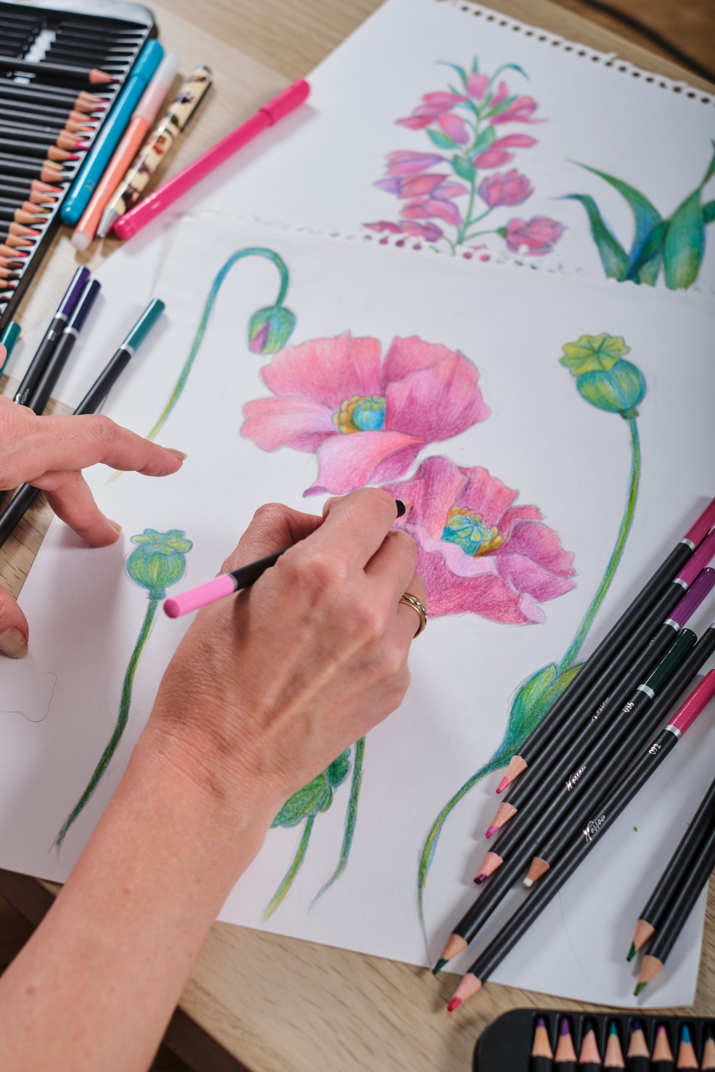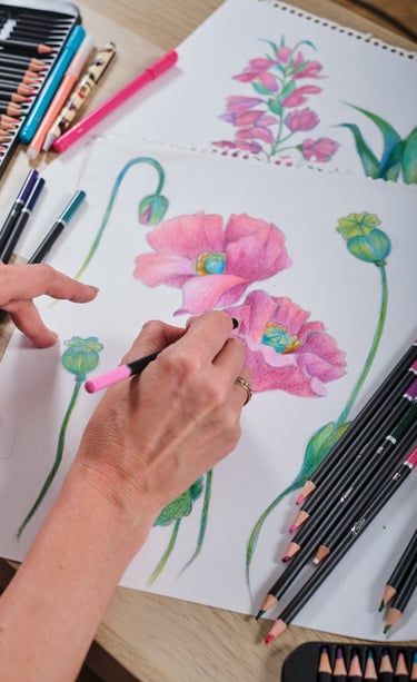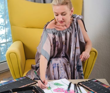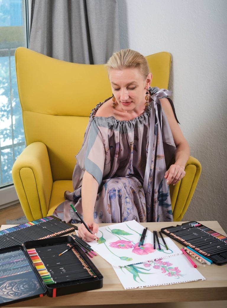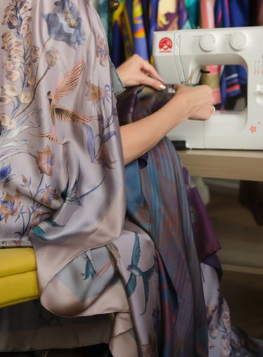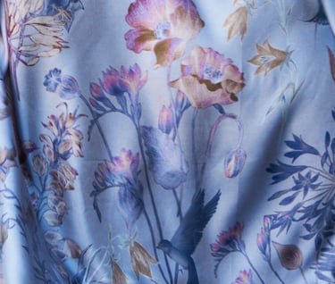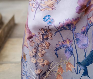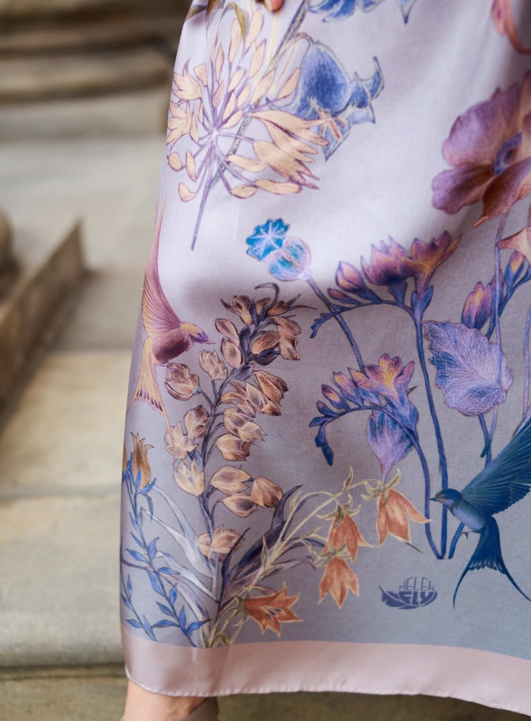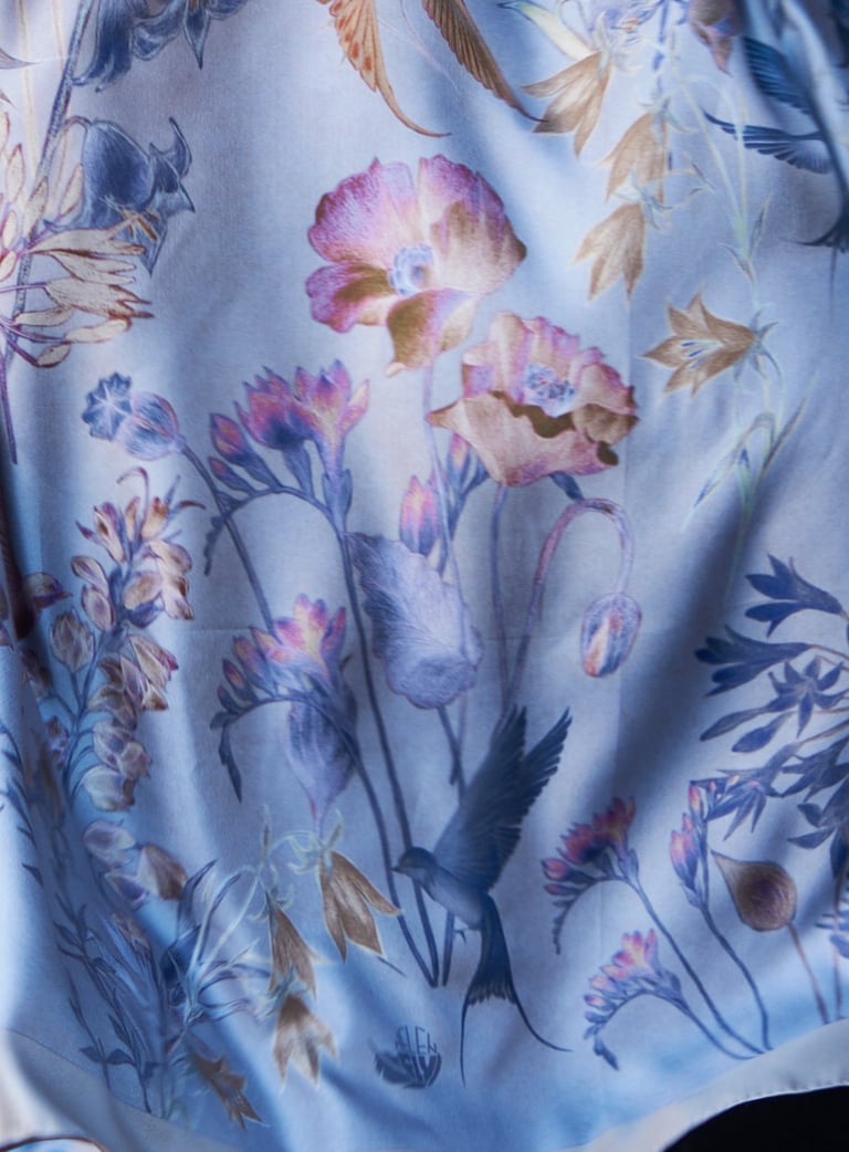 Our designs are created in different ways. Sometimes it is initially a computer design, vector graphics. But as a rule, the design is always based on a hand drawing. These are drawings with a pencil, liner, watercolor, dry pastel, and sometimes a combination of different techniques. After creating a design sketch, all its elements begin to be drawn on paper. Then the elements are scanned, and further assembly of the design takes place on the computer. Placing elements in volume, creating a background, general color correction of the entire finished layout. Each of the stages is a long, painstaking process. As a rule, each design is prepared for at least a month. The final stage is preparing the design for printing in compliance with all technical specifications. We work with the best factories in the world that carry out double-sided printing on silk. Our products do not have a faded back side, in the cut of your dress or in an open kimono, the fabric will be as bright as on the front side. In the same product as a scarf or a scarf, both sides are equally bright - this is a must. The quality of our silk products will allow you to pass these things on to your children. Their brightness does not fade over the years, the products can be washed by hand. They are easy to care for, after wearing they do not require thorough steaming on an ironing board. It is enough to hang the thing - and the silk will straighten out. For strong creases it is enough to direct a stream of steam.
